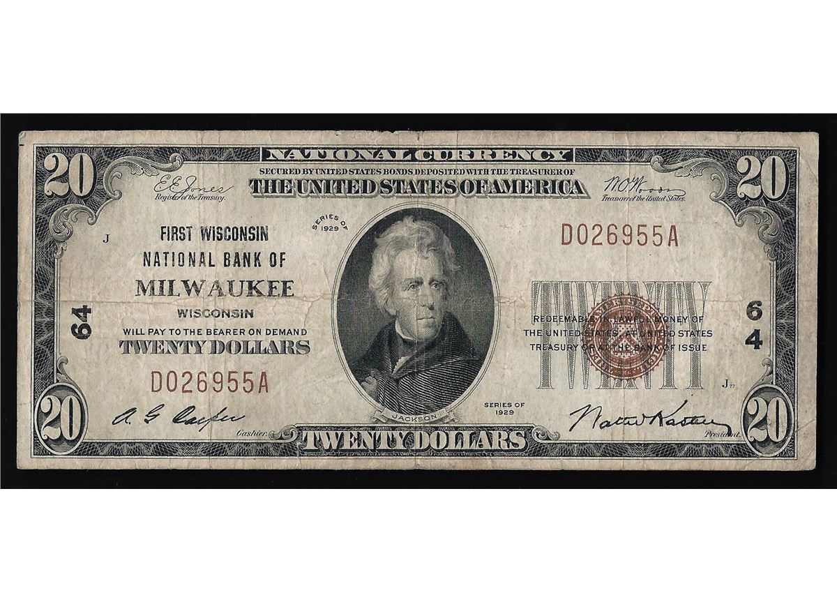 One 1929 $20 National Bank of Milwaukee Currency Note.