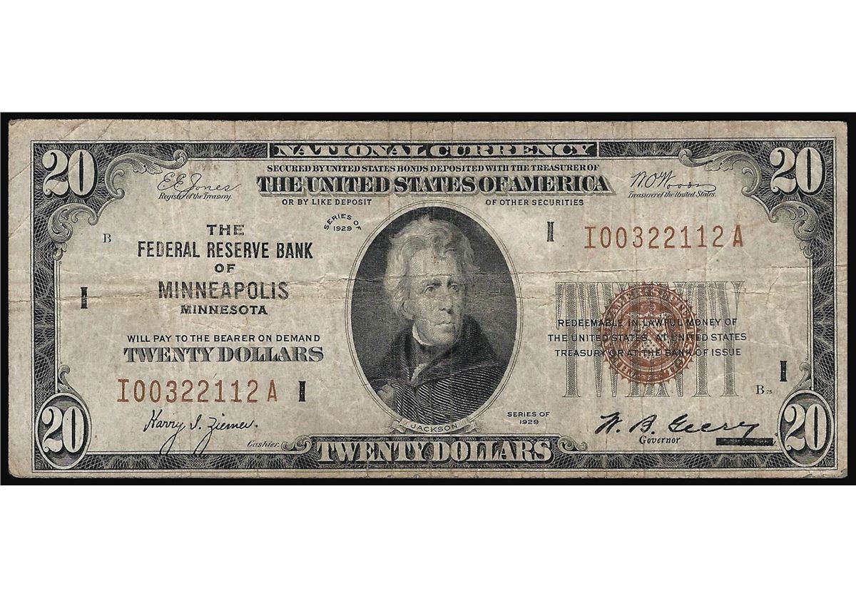 One 1929 $20 National Bank of Minneapolis, MN National Currency Note.