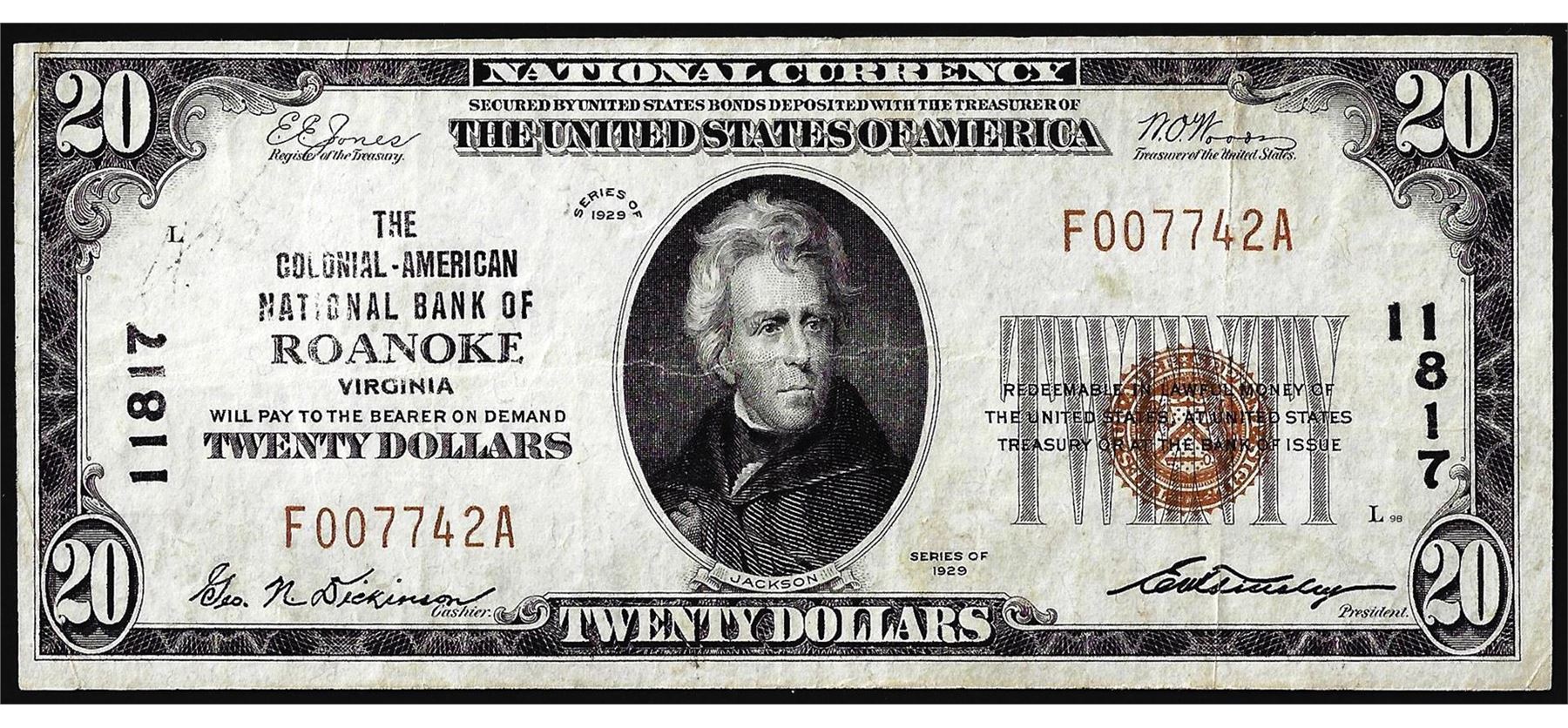 One 1929 $20 National Bank of Roanoke, VA CH# 11817 National Currency Note.