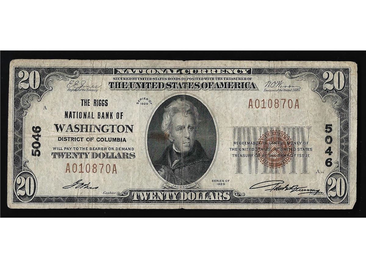 One 1929 $20 National Bank of Washington Currency Note.