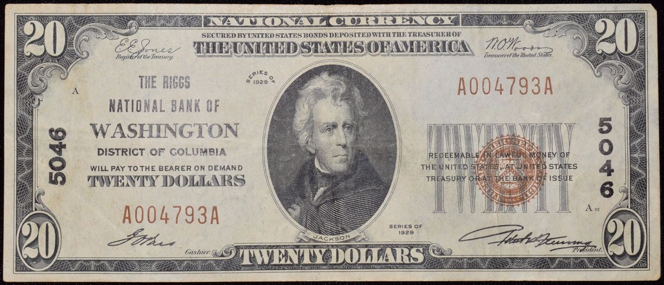 One 1929 $20 National Bank of Washington Note.