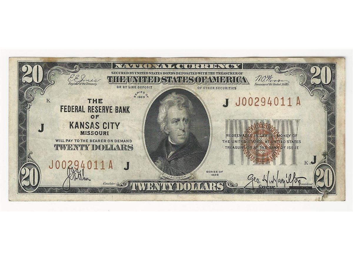 One 1929 $20 National Currency Note Bank of Kansas City, MO.