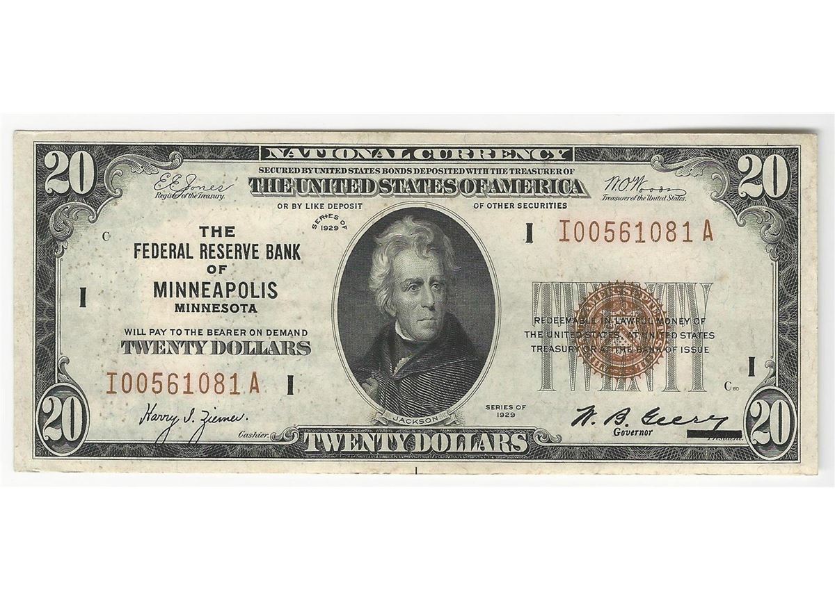 One 1929 $20 National Currency Note Bank of Minneapolis, MN.