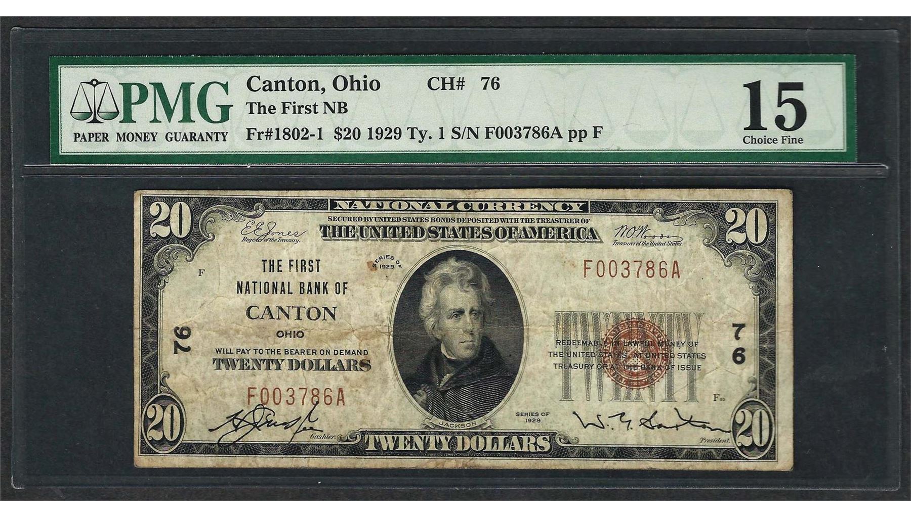 One 1929 $20 National Currency Note Canton, Ohio CH# 76 PMG Choice Fine 15. PMG Certified.
