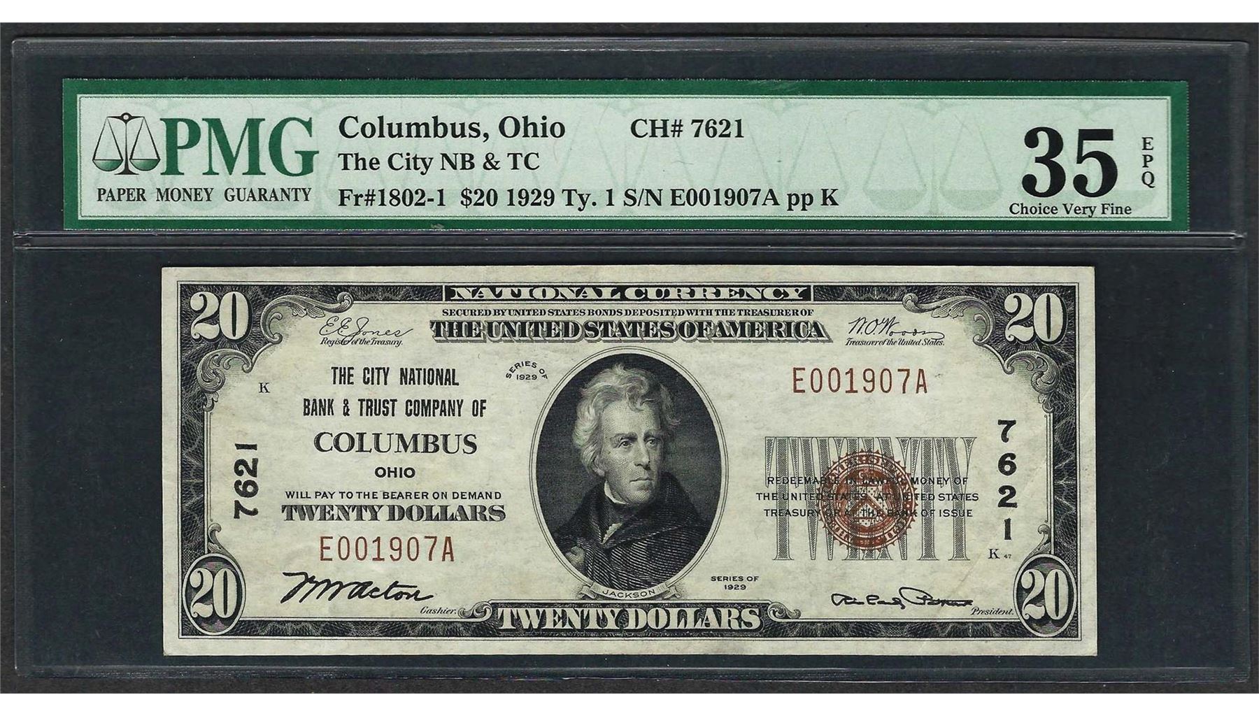 1929 $20 National Currency Note Columbus, Ohio CH# 7621 PMG Choice Very Fine 35E