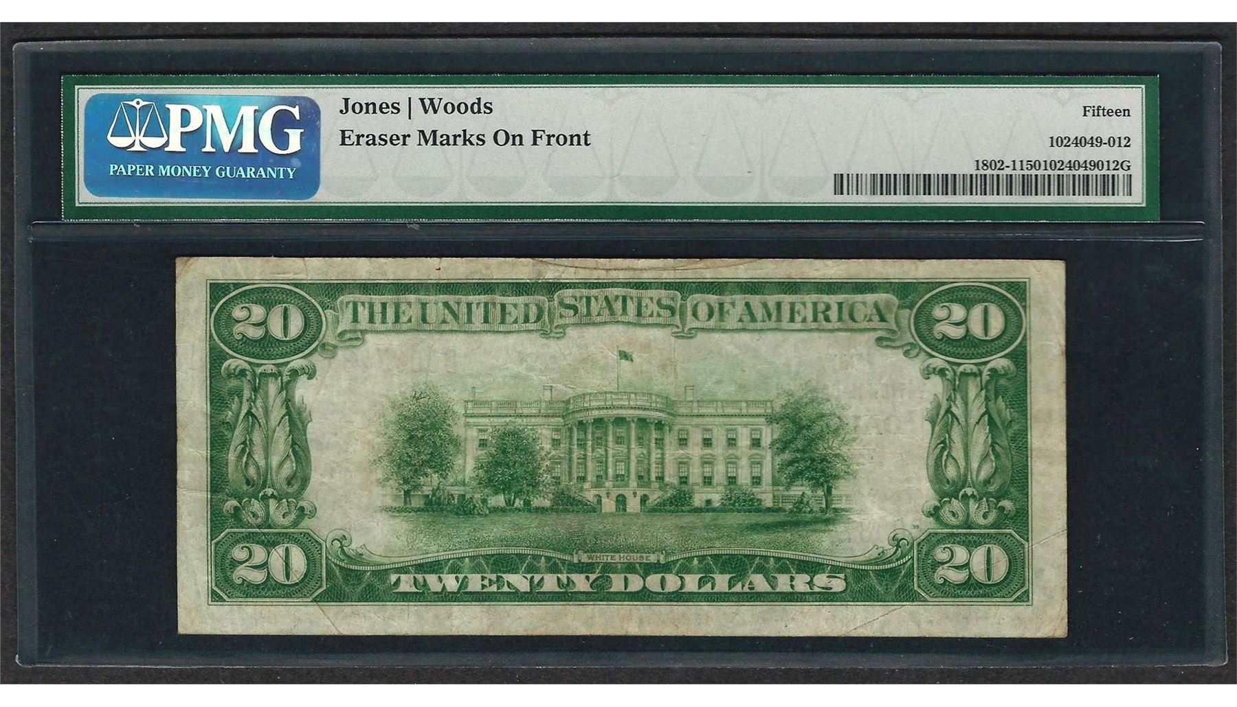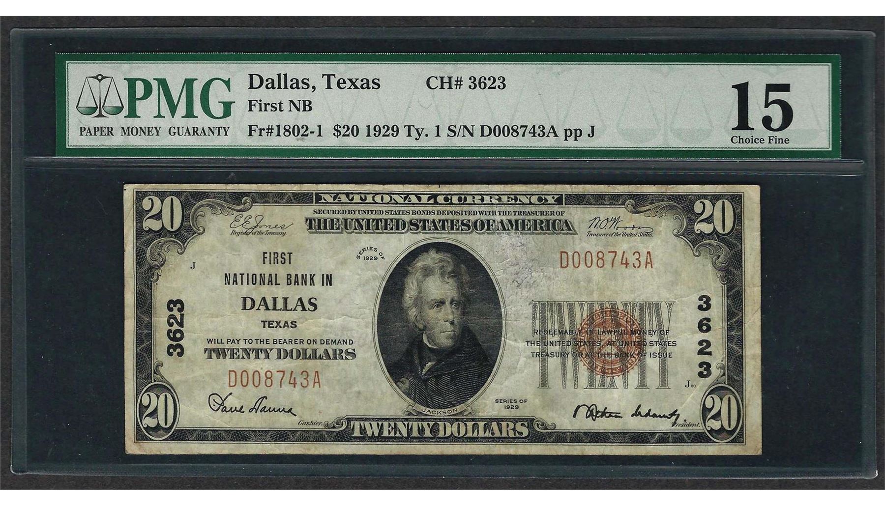 One 1929 $20 National Currency Note Dallas, Texas CH# 3623 PMG Choice Fine 15. PMG Certified.