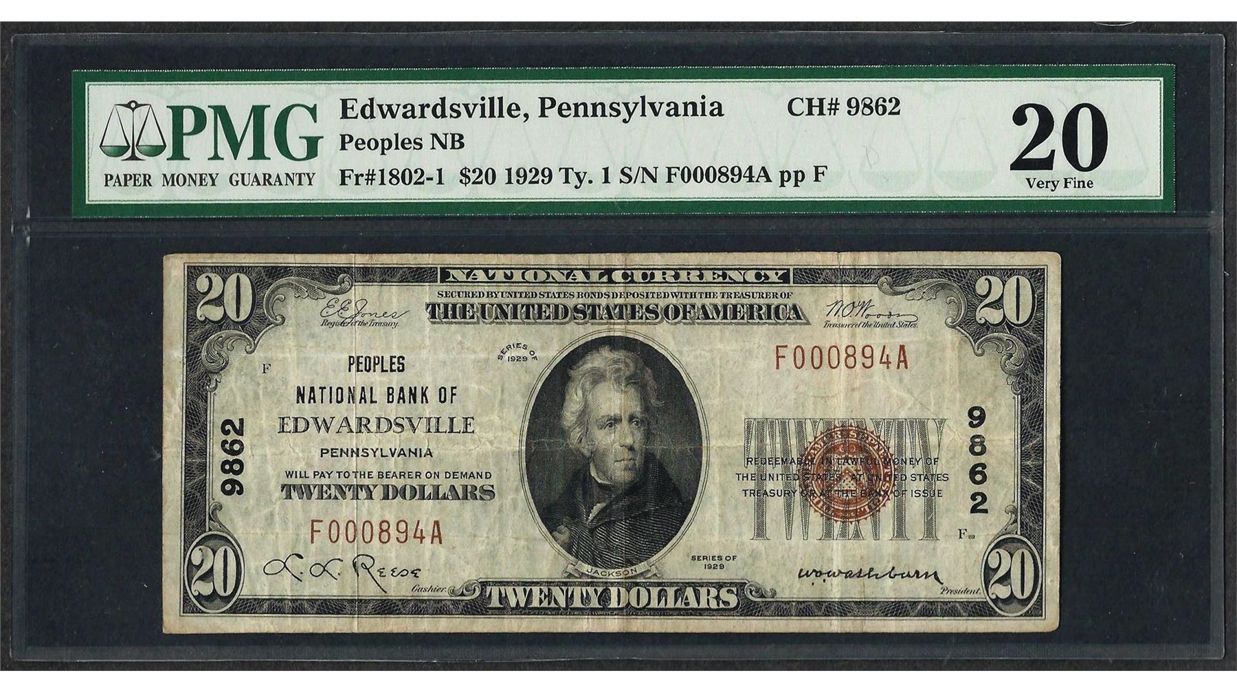 One 1929 $20 National Currency Note Edwardsville, PA CH# 9862 PMG Very Fine 20. PMG Certified.