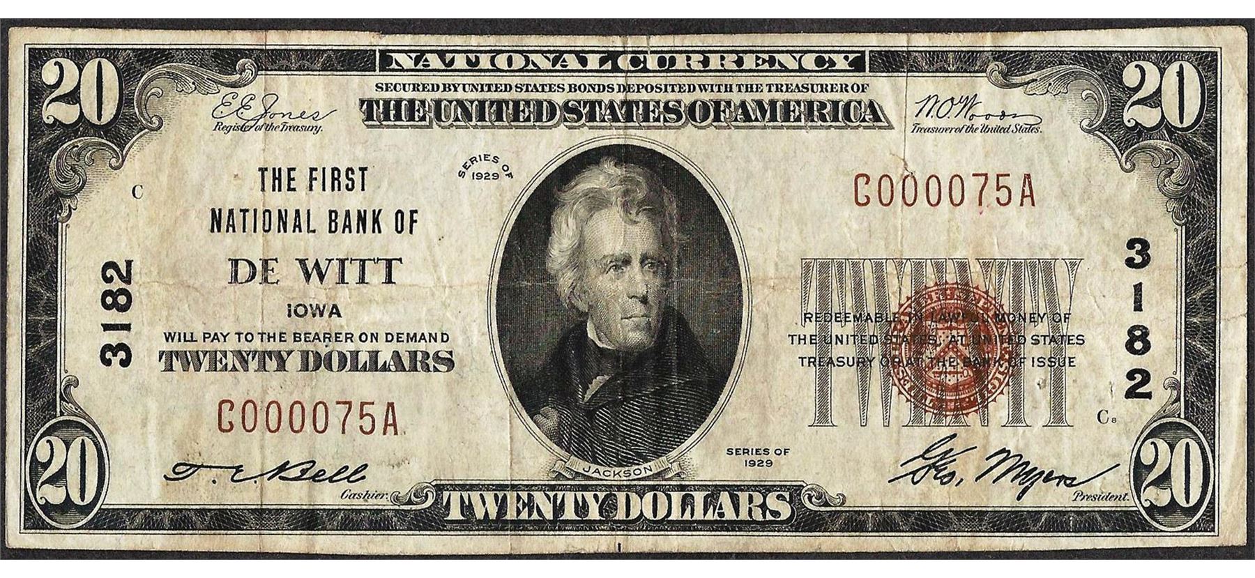 1929 $20 National Currency Note First NB of De Witt, Iowa CH# 3182 Low Serial