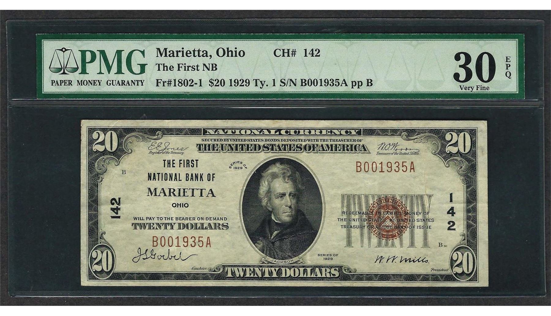 One 1929 $20 National Currency Note Marietta, Ohio CH# 142 PMG Very Fine 30EPQ. PMG Certified.