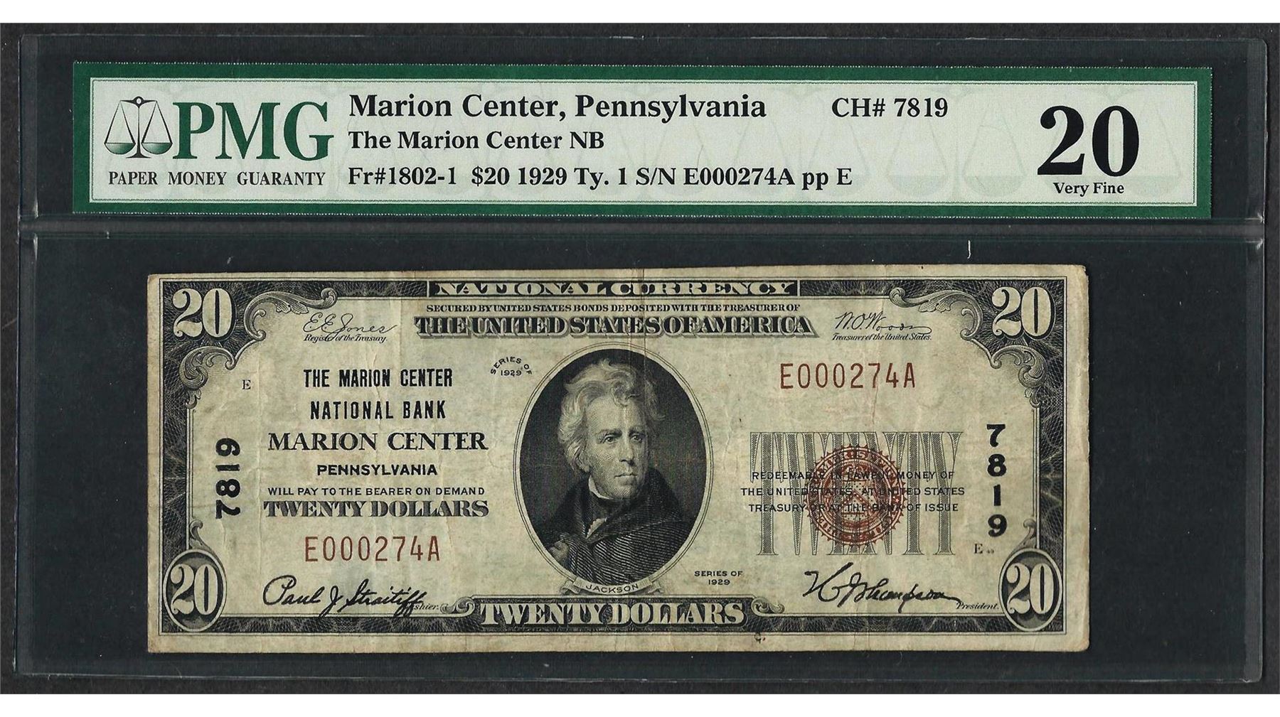 1929 $20 National Currency Note Marion Center, PA CH# 7819 PMG Very Fine 20