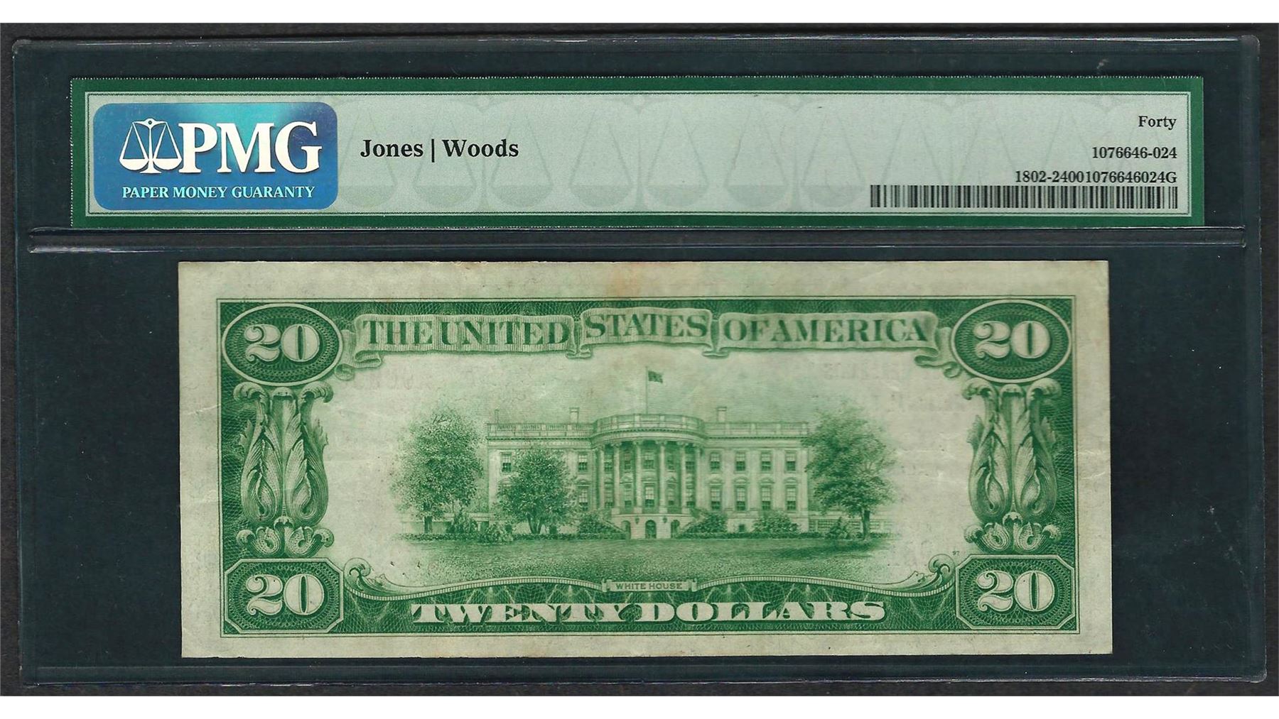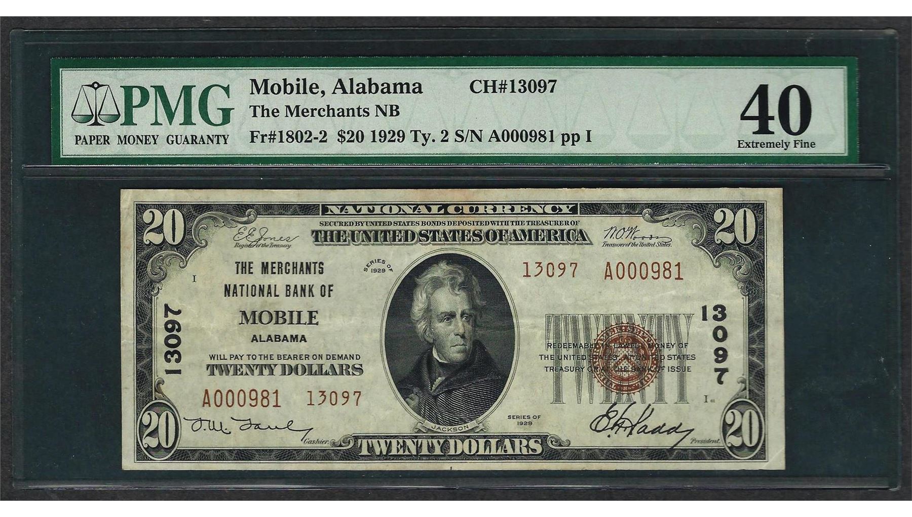 One 1929 $20 National Currency Note Mobile, Alabama CH# 13097 PMG Extremely Fine 40. PMG Certified.