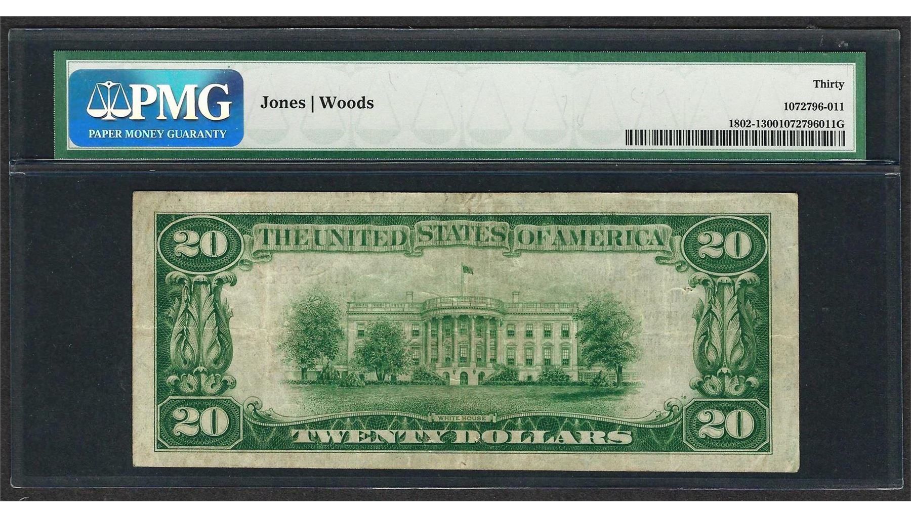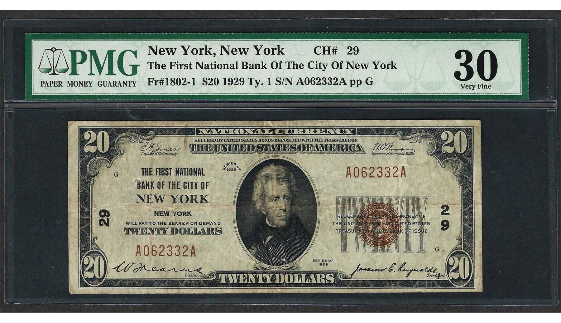 One 1929 $20 National Currency Note New York, New York CH# 29 PMG Very Fine 30. PMG Certified.