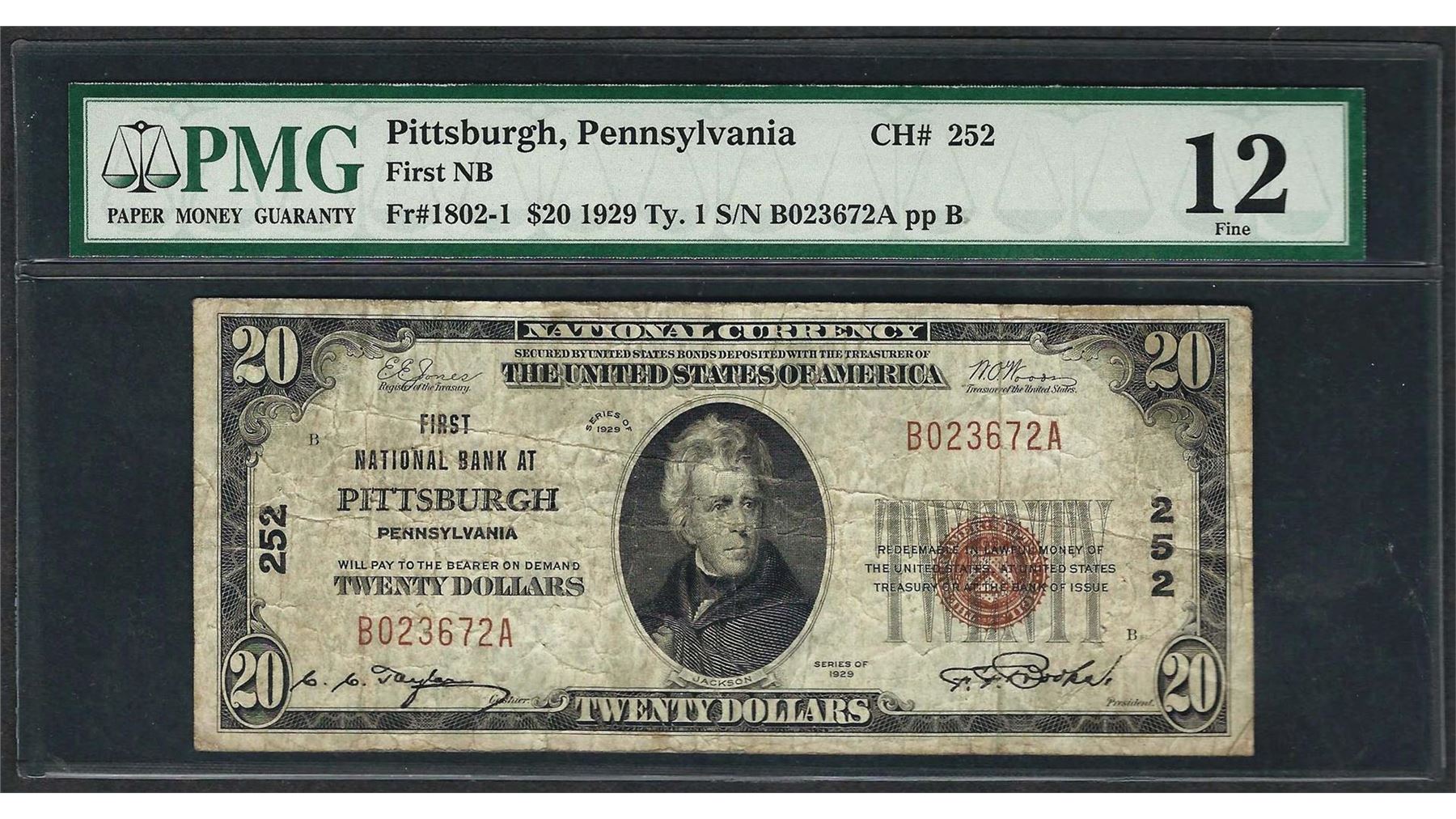 One 1929 $20 National Currency Note Pittsburgh, Pennsylvania CH# 252 PMG Fine 12. PMG Certified.
