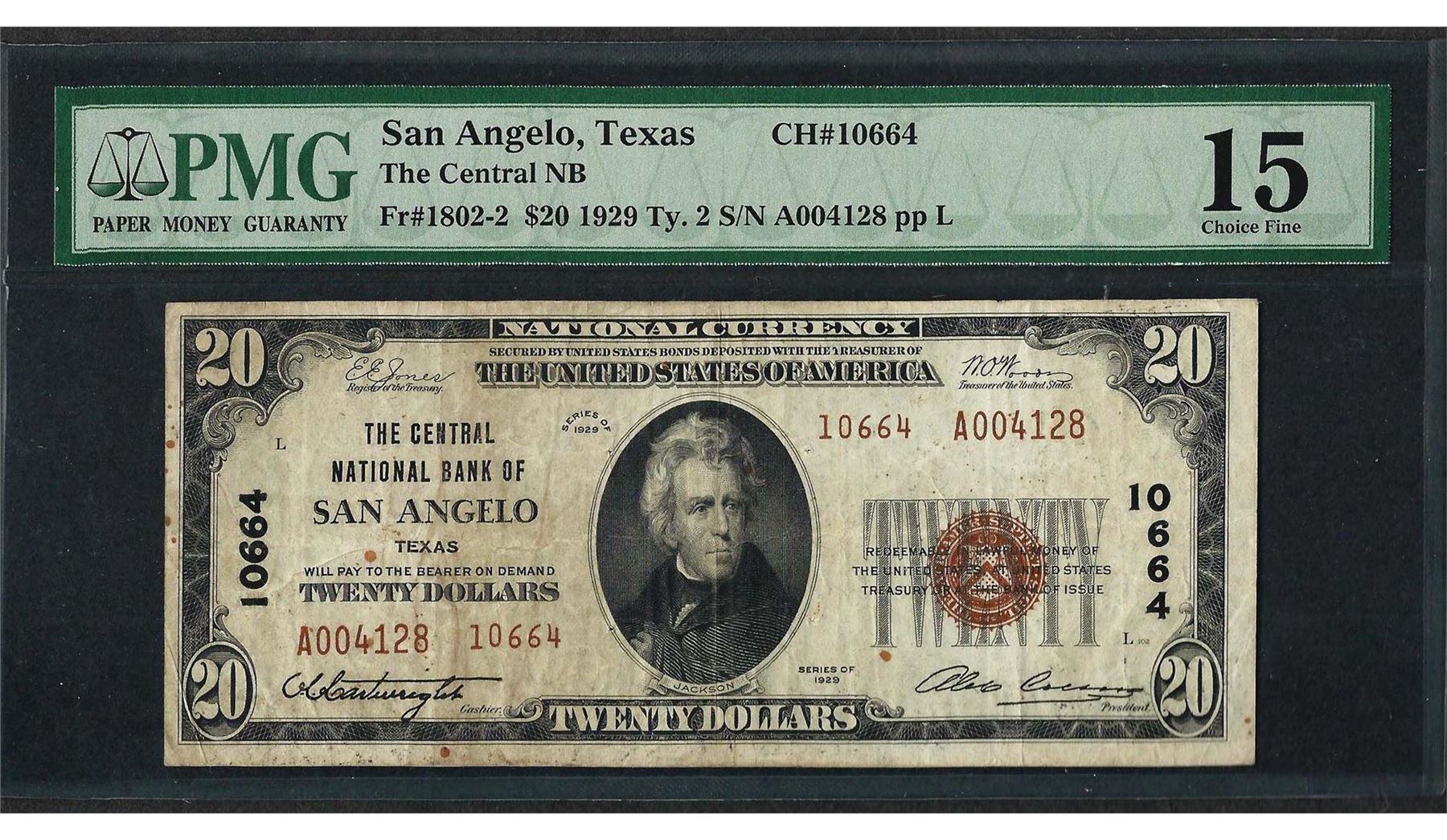 One 1929 $20 National Currency Note San Angelo, TX CH# 10664 PMG Choice Fine 15. PMG Certified.