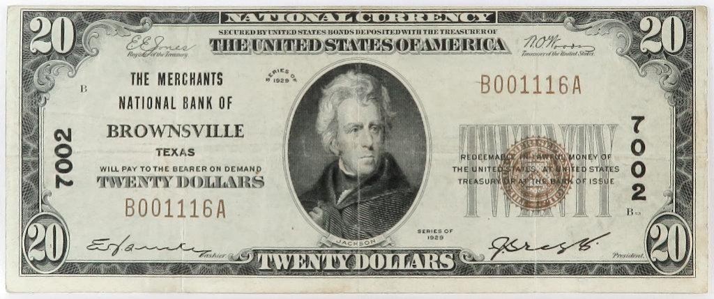 1929 $20 National Currency Note - The Merchants National Bank of Brownsville, Texas. CH# 7002 FR# 1802-1.