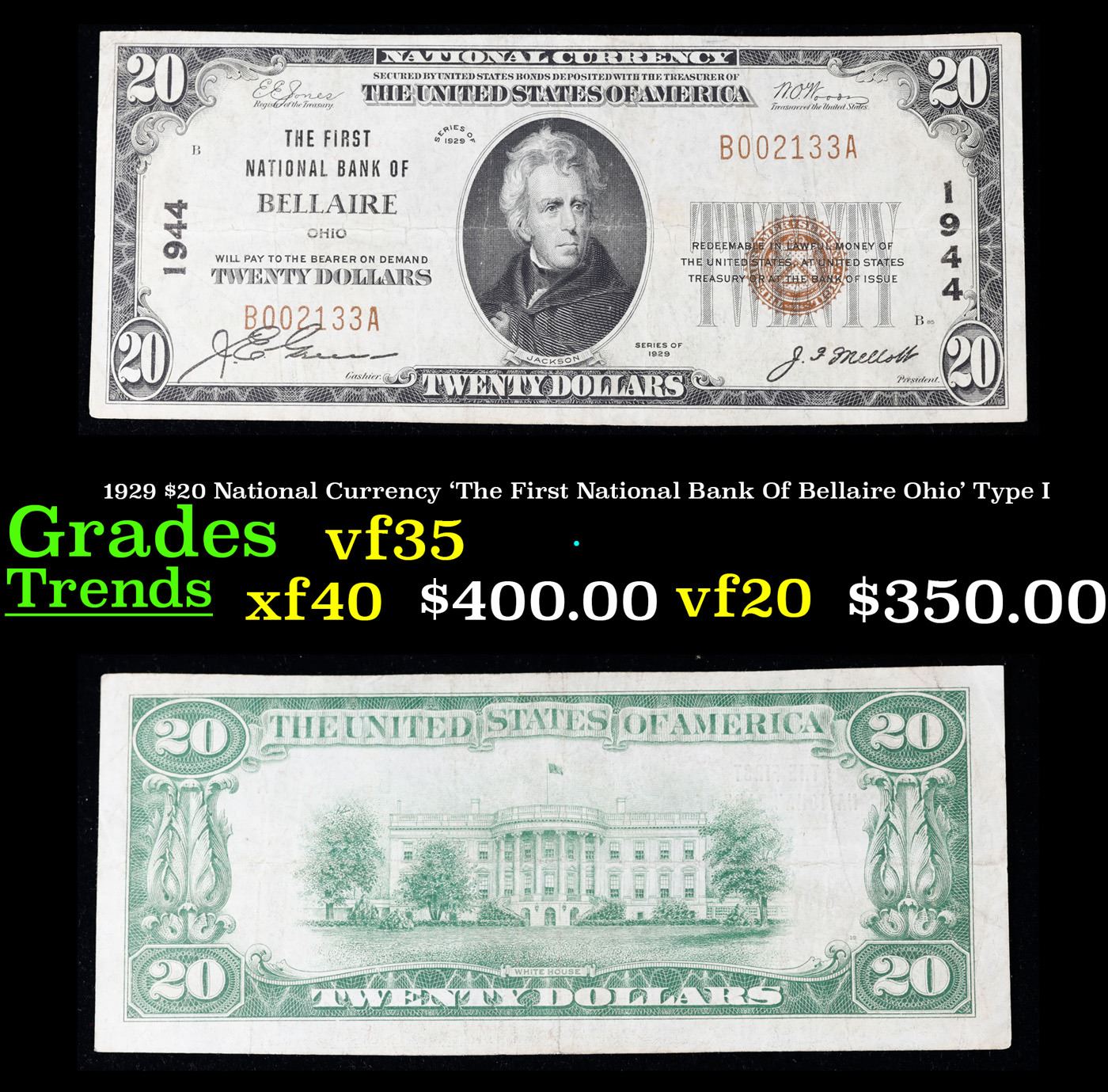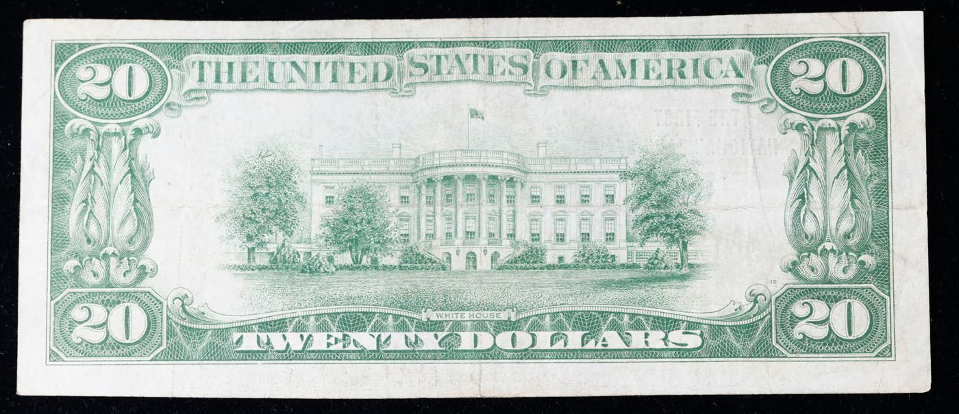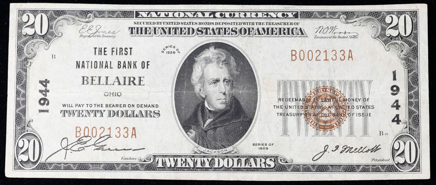 1929 $20 National Currency 'The First National Bank Of Bellaire Ohio' Type I Grades vf++. Backed by bonds deposited with the Federal Government, this kind of money says “National Currency” at the top center of the note. These notes were issued by banks who received a Charter from the United States government allowing them to issue money. The Government Printing Office printed these notes with the same design except for the name of the banks, signatures of the bank officers and the Charter number. National Currency notes were made from 1863 to 1929. These notes were a way of creating confidence in an always shaky banking system. Member banks were required to deposit bonds with the government. The bank could then issue currency equal to 90% of the amount of the bonds. The financial panic of 1929 destroyed many of the National Banks and put an end to this system.There were more than 14,000 banks that issued National Currency and there are large numbers of avid collectors. The 1929 issue was the only “small size” issue, that is to distinguish from the “horse blanket” size notes of years previous to 1929. The note comes in two types. The Type I note has a brown seal with the charter number only in large black numerals. Type 2 notes have in addition the charter number printed with brown letters near the serial number of the note. This is from the 'Bank of America and Saving Association San Francisco' Charter number 13044. National Currency was only made at this bank in 1929