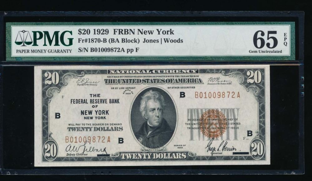One 1929 $20 New York Federal Reserve Bank Note PMG 65EPQ.