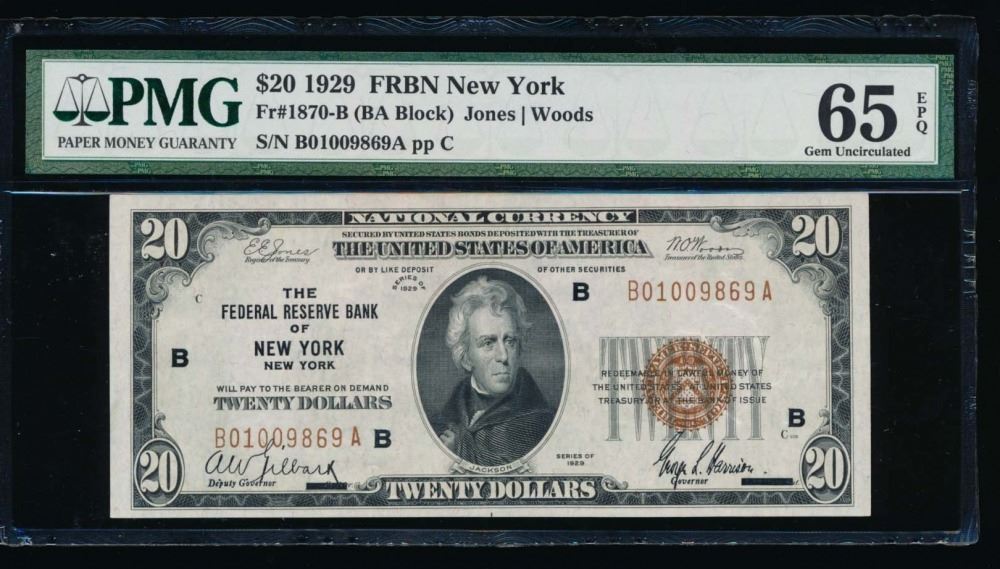 One 1929 $20 New York National Bank Note PMG 65EPQ.