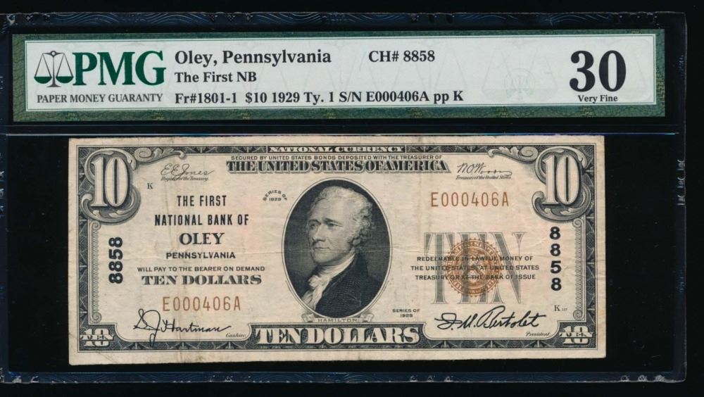One 1929 $20 Oley National Bank Note PMG 30.