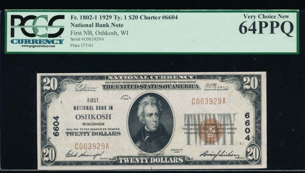 One 1929 $20 Oshkosh National Bank Note PCGS 64PPQ.