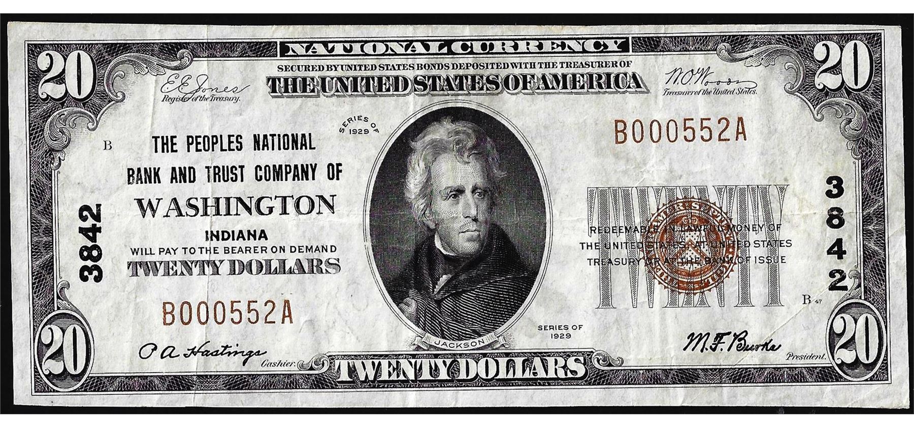 One 1929 $20 Peoples Bank & Trust of Washington, Indiana CH# 3842 National Currency Note.