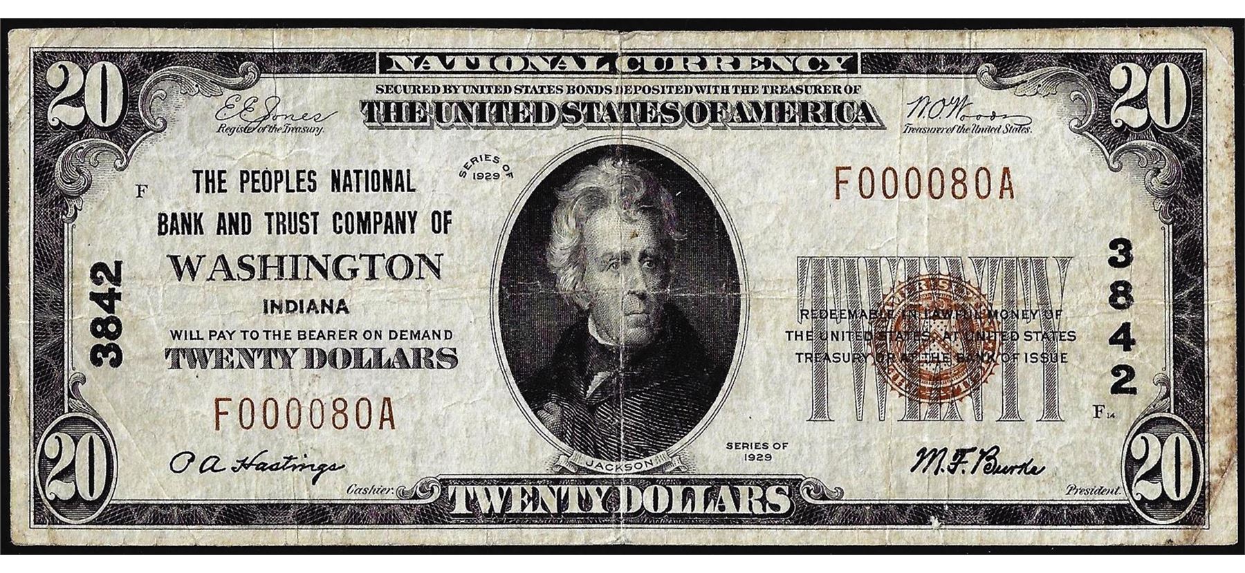 1929 $20 Peoples Bank & Trust of Washington, Indiana CH# 3842 National Currency Note