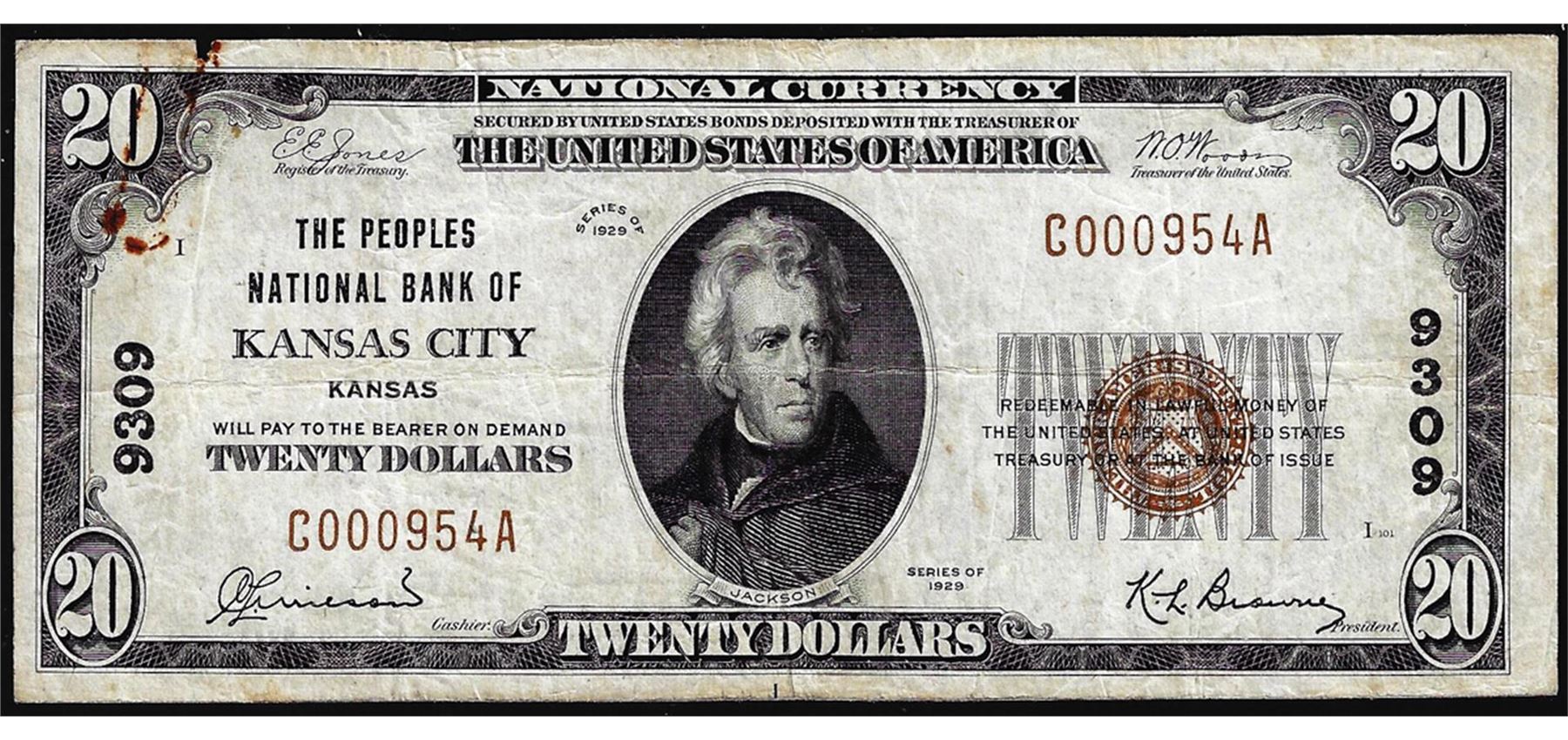 One 1929 $20 Peoples NB of Kansas City, KS CH# 9309 National Currency Note.