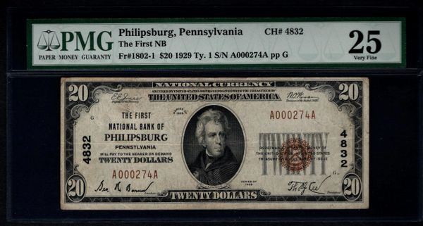 One 1929 $20 Philipsburg National Bank Note PMG 25.