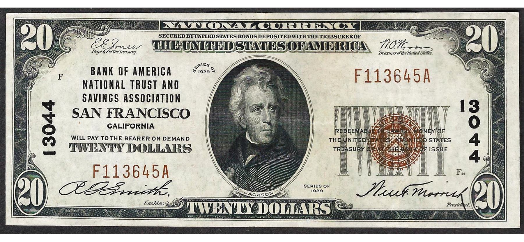 One 1929 $20 San Francisco California National Currency Note CH# 13044.