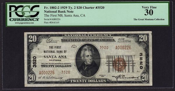 One 1929 $20 Santa Ana National Bank Note PCGS 30.
