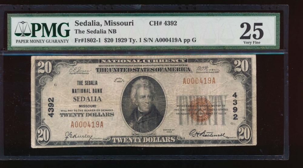 One 1929 $20 Sedalia Missouri Nation Bank Note PMG 25.