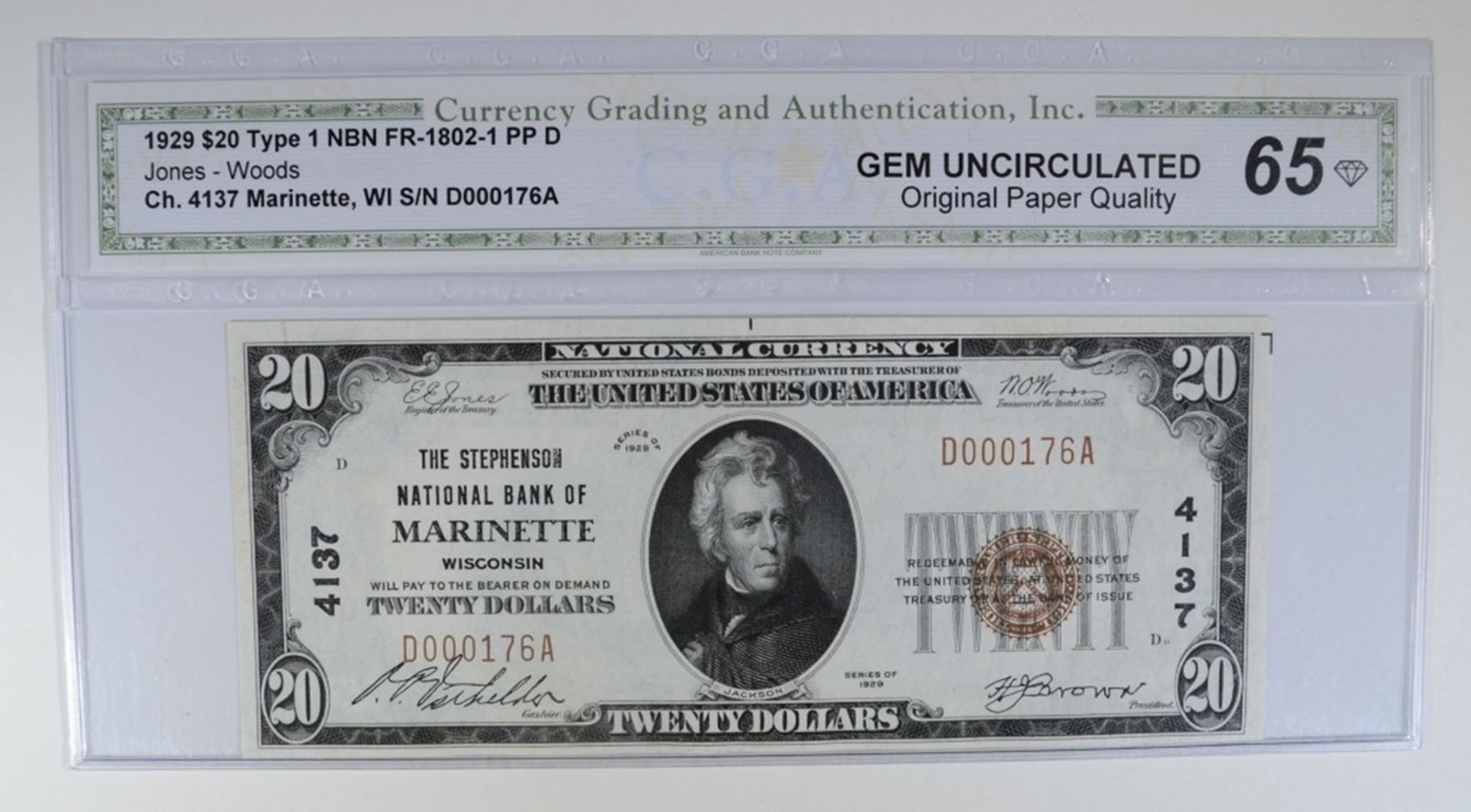 THE STEPHENSON NATIONAL BANK OF MARINETTE WISCONSIN CGA GEM UNC OPQ LOW SERIAL # 2ND HIGHEST GRADED ONLY 1 HIGHER ESTIMATE $450 - $475.
