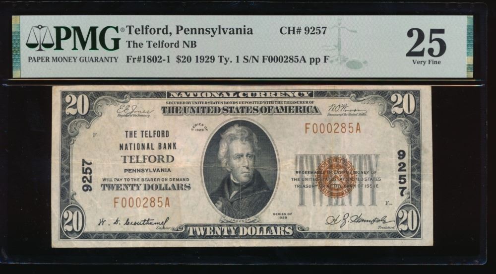 One 1929 $20 Telford PA National PMG 25.
