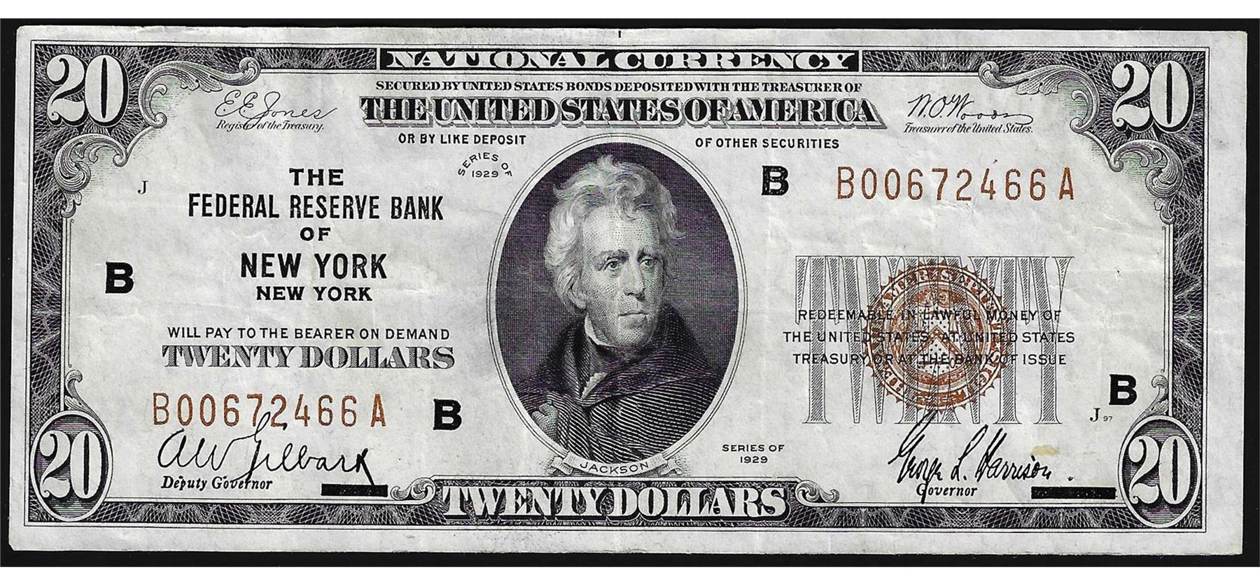 1929 $20 The Federal Reserve Bank of New York National Currency Note