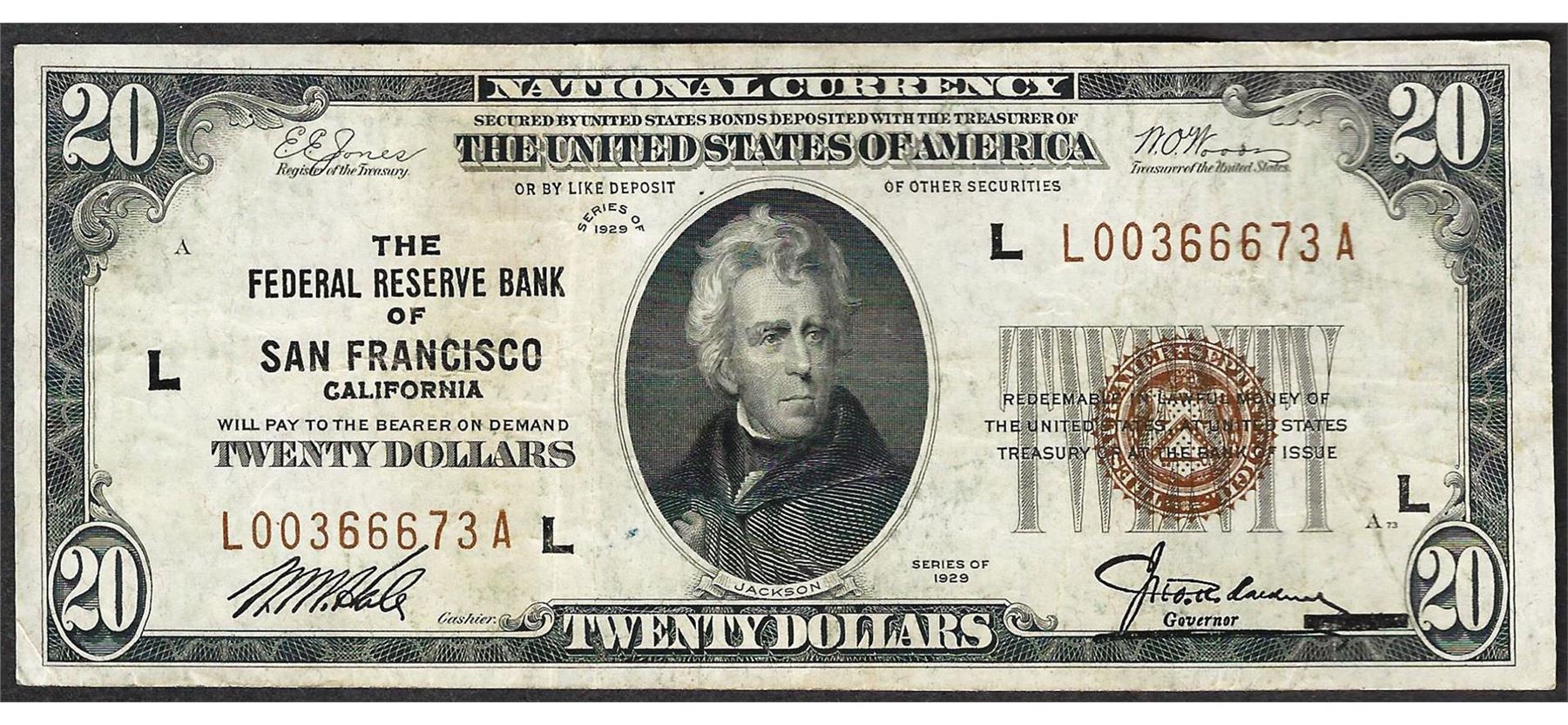 One 1929 $20 The Federal Reserve Bank of San Francisco Note.