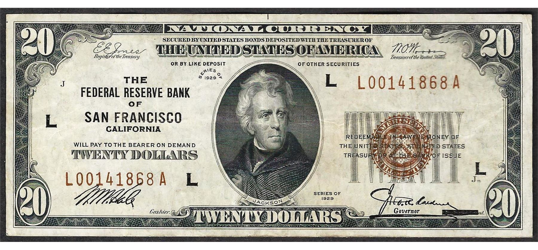 One 1929 $20 The Federal Reserve Bank of San Francisco Note.