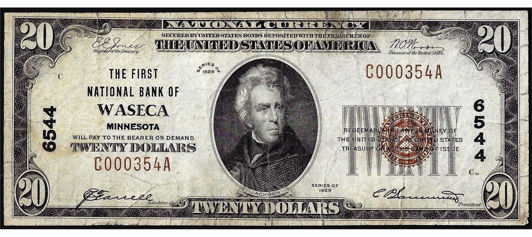 1929 $20 The First National Bank of Waseca, Minnesota CH# 6544 National Currency Note