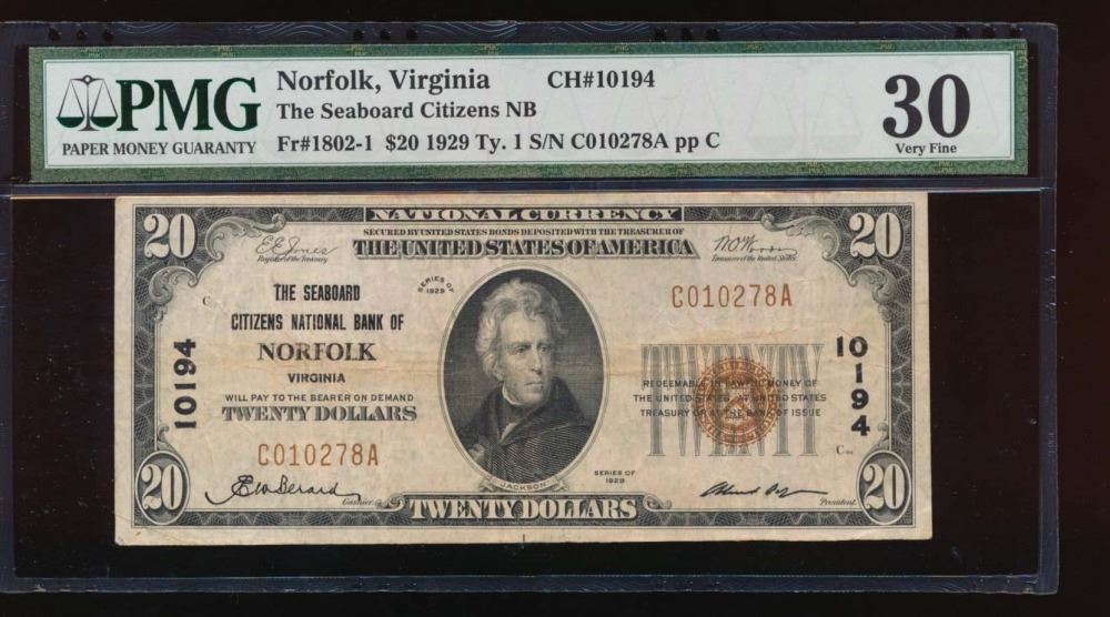 One 1929 $20 The Seaboard Citizens Nation Bank Note PMG 30.