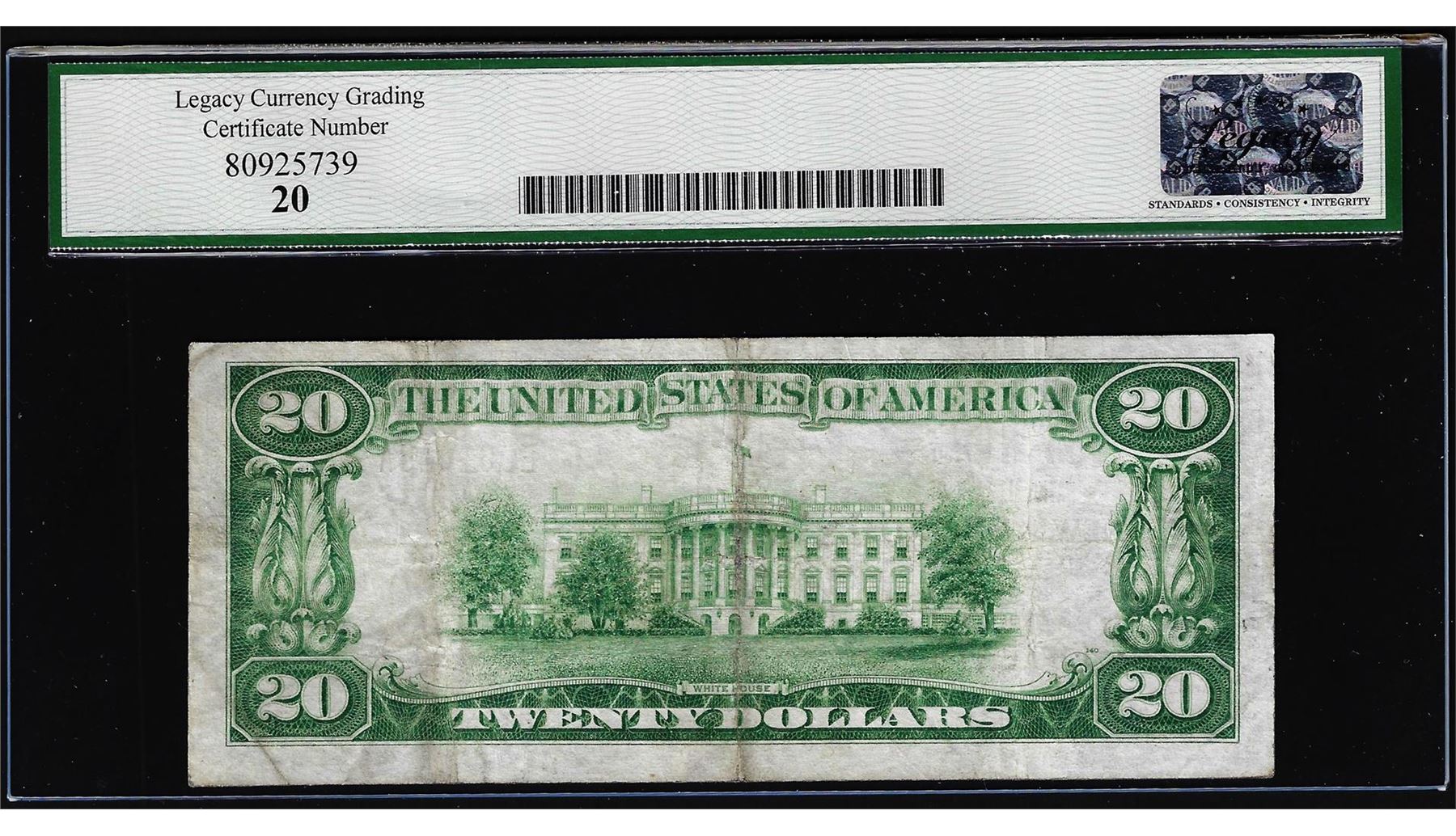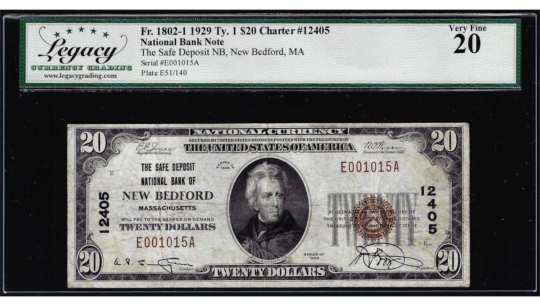 One 1929 $20 The Second NB New Beford, MA CH# 12405 National Currency Note Legacy VF20. Legacy Graded.