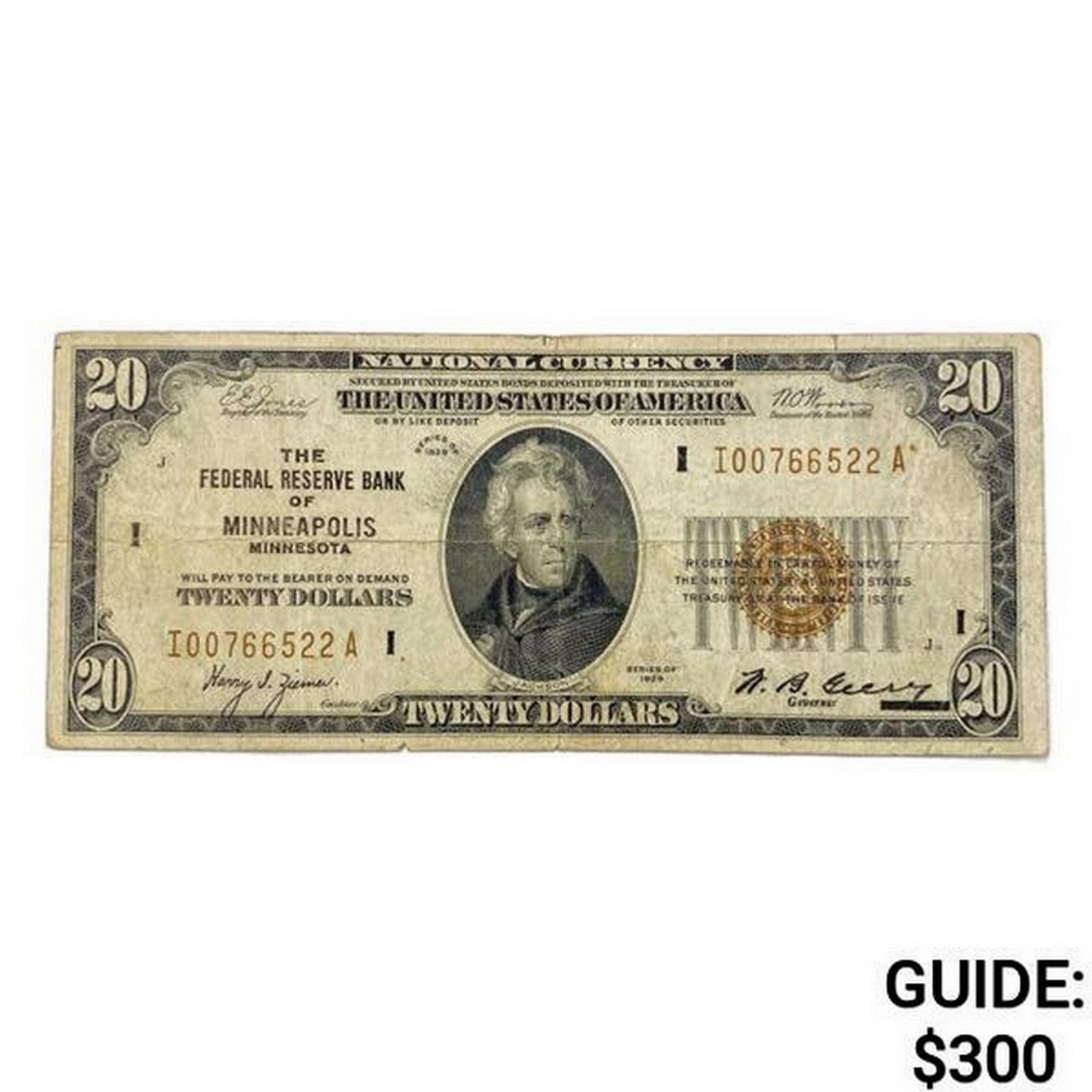 1929 $20 US MinneapolIs Bank, MO Fed Res Note