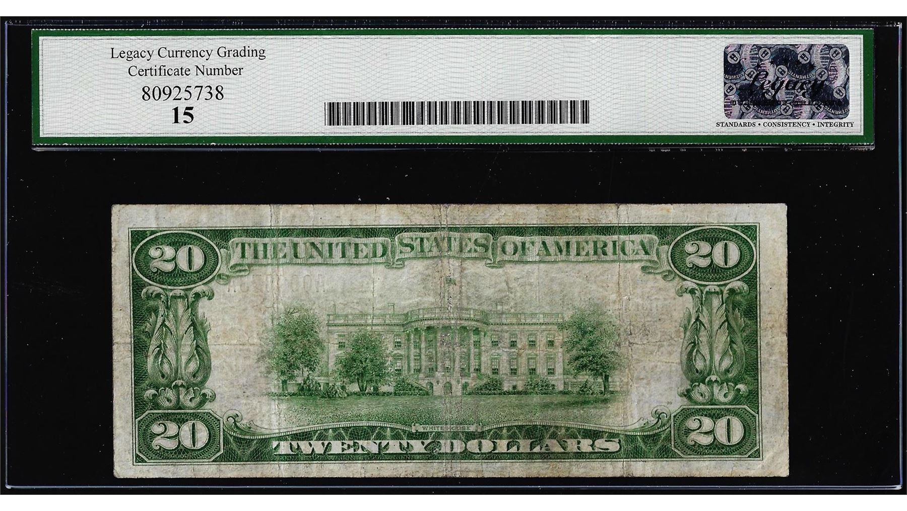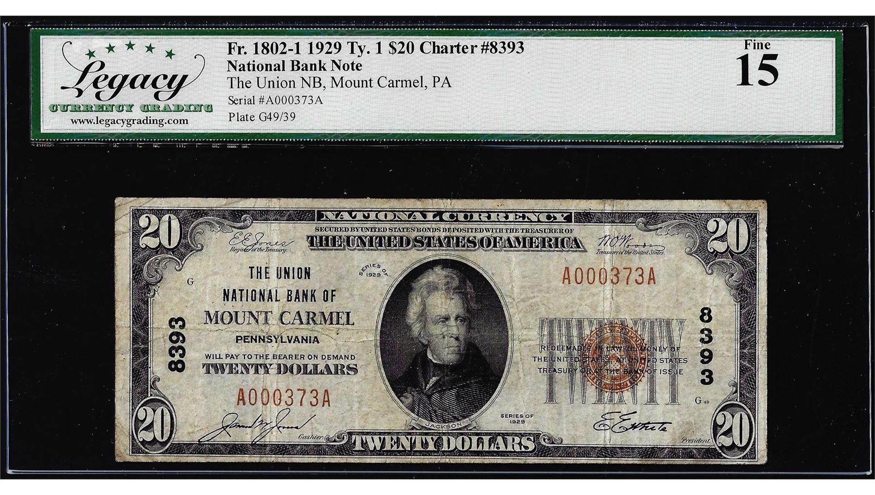 One 1929 $20 Union NB Mount Carmel, PA CH# 8393 National Currency Note Legacy Fine 15. Legacy Graded.