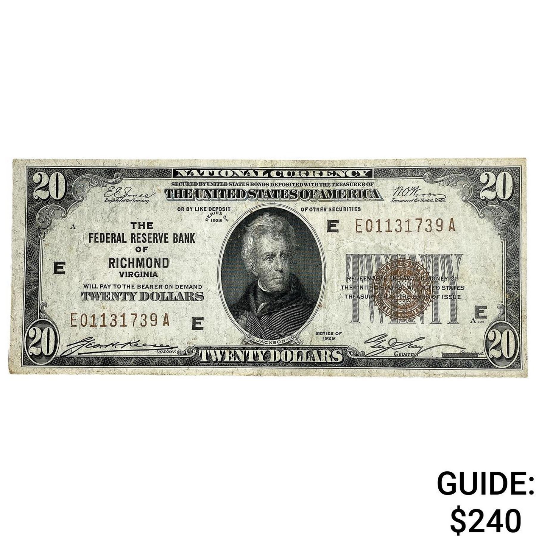 1929 $20 United States Fed. Note Bank of Richmond VA
