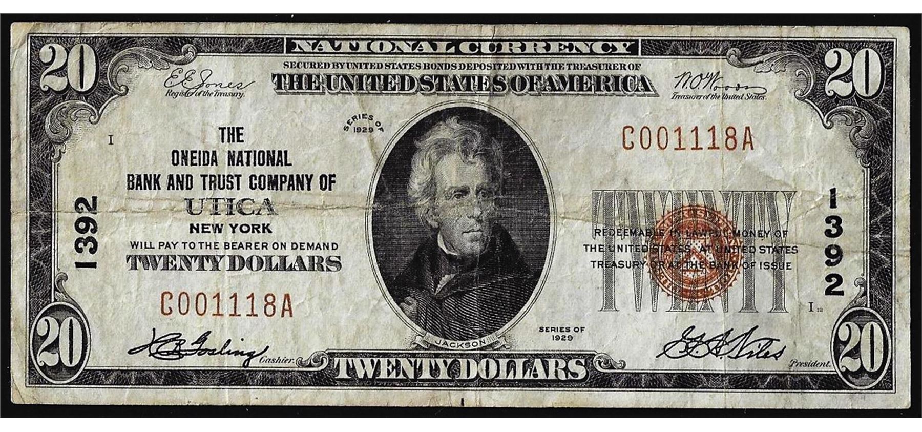 One 1929 $20 Utica, NY CH# 1392 National Currency Note.