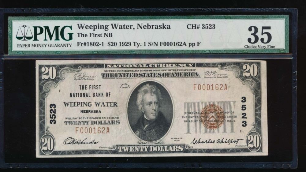 One 1929 $20 Weeping Water National Bank Note PMG 35.