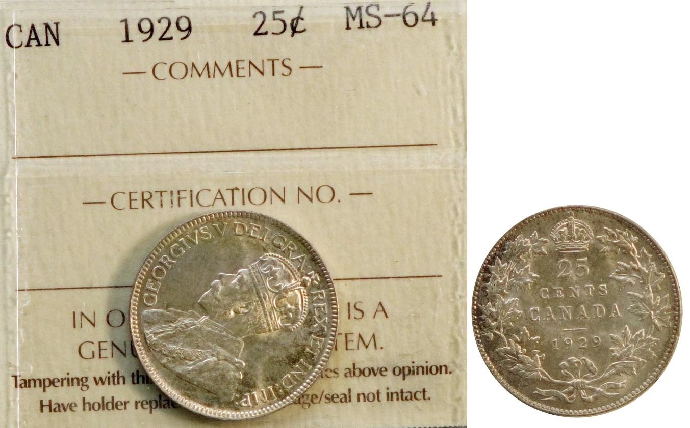 The cataloguer has taken every reasonable measure to ensure that all of the lots in this sale are as described and genuine. All raw coins and banknotes have been graded by the cataloger or the auction house which represent our best professional opinion. To grade coins and banknotes, we use Canadian grading standards, 42 years of experience and good conscience. However, grading is a subjective description in the opinion of the cataloger or the auction house. Among experts there are often differences of opinion on the grading and the eye appeal of a coin. The strike and the state of preservation are often debated. The Canadian Numismatic Company acts as an agent between consignors and buyers. The Canadian Numismatic Company does not guarantee that any coin or banknote cataloged will meet the standards, or the grade, of any third party grading companies. No warranty, whether impressed or implied. Items are as is, no warranty given. We cannot accept responsibility and waive all liability resulting in financial losses, and or incidentals accruing from the sale of any items, nor can we guarantee that items graded by third party services will grade the same if submitted to a different grading service or re-submitted to the same company. Statements by The Canadian Numismatic Company regarding the condition, the eye appeal, the strike and the population of items are for guidance only. All lots offered are sold "AS IS". Title to all lots remains with the auction house until paid for in full by the purchaser. But they are held at the risk of the purchaser once the time of the sale.