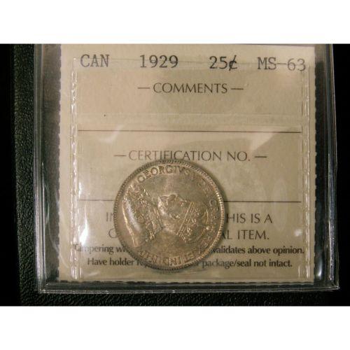 1929 25¢ ICCS MS63, a mintstate example with lots of lustre.