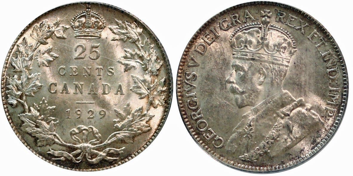 1929 25¢ PCGS Choice Mint State-63. Frosty whites with peripheral tints.