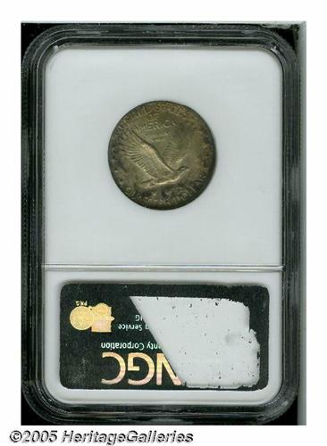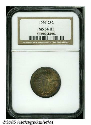<B>1929<25C> MS64 Full Head NGC.</B></I> This near-Gem is blanketed by deep golden-brown, magenta, and steel-blue patination on the obverse, while the reverse takes on less intense wisps of the same color pattern. The design elements are sharply impressed, and there appear to be no significant marks.