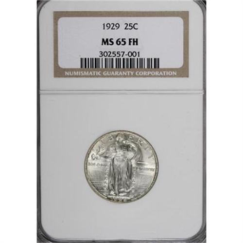 <B>1929 25C MS65 Full Head NGC.</B></I> Whispers of faint tan grace the strongly lustrous surfaces of this late-date Philadelphia Standing Liberty quarter. A sharply struck piece from Liberty's toes up, culminating in the Full Head designation. A few minute marks on each side are entirely consistent with the Gem grade.<BR><BR><B>Coin Engraver:</B> Hermon A. MacNeil<BR><BR><b>Shipping:</b> Coins & Currency (<a target="_blank" href="http://www.heritageauctions.com/common/shipping.php">view shipping information</a>)