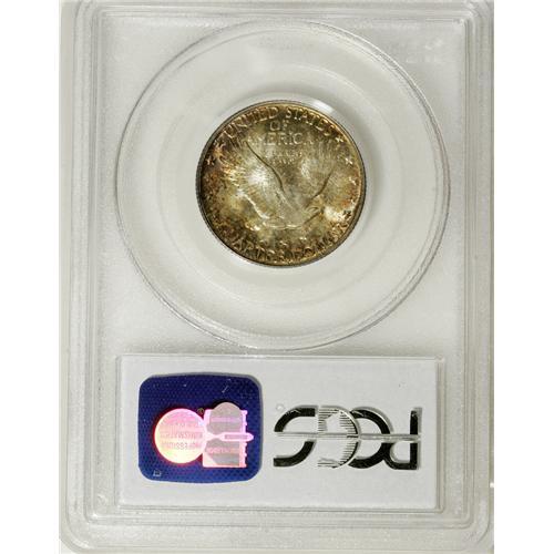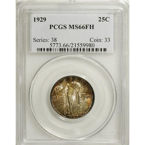 <B>1929 25C MS66 Full Head PCGS.</B></I> Richly toned overall in multicolored hues, with vibrant underlying luster. A wonderfully original Standing Liberty quarter with a great strike and no mentionable marks. Population: 79 in 66 Full Head, 7 finer (4/07).<BR><BR><b>Shipping:</b> Coins & Currency (<a target="_blank" href="http://www.heritageauctions.com/common/shipping.php">view shipping information</a>)